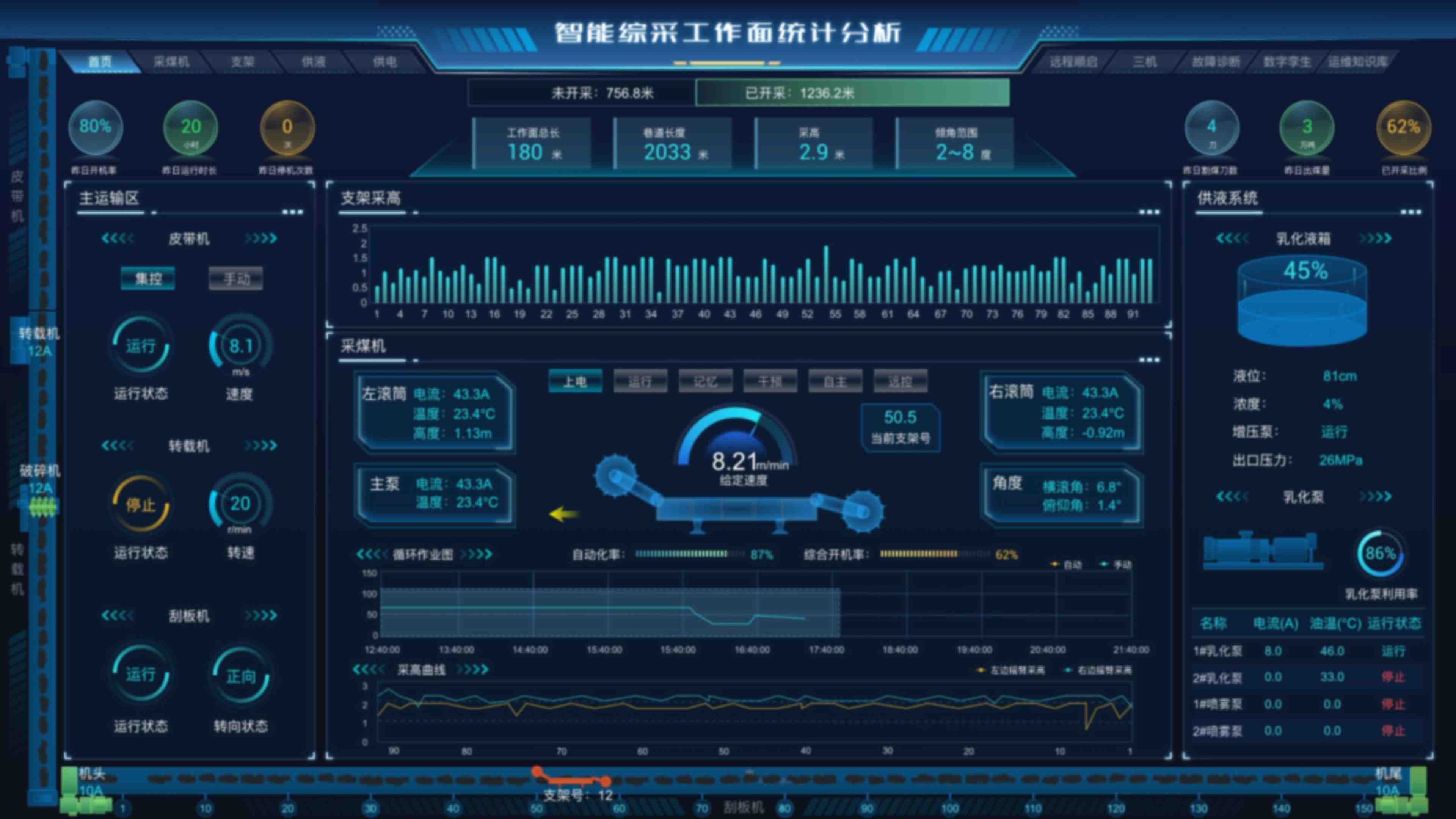 全面整合采煤机、液压支架、“三机”(刮板输送机、破碎机、转载机)、泵站、供电系统、供液系统等设备运行数据。通过总览页,地面调度中心、顺槽监控中心可以实现对综采工作面各设备的协调管理和集中控制,并通过深度数据分析动态优化设备的割煤速度、液压支架的支护强度等参数,实现生产过程的精细化管理,确保整个综采系统始终处于高效、稳定的运行状态,最大程度地提高生产效率。
