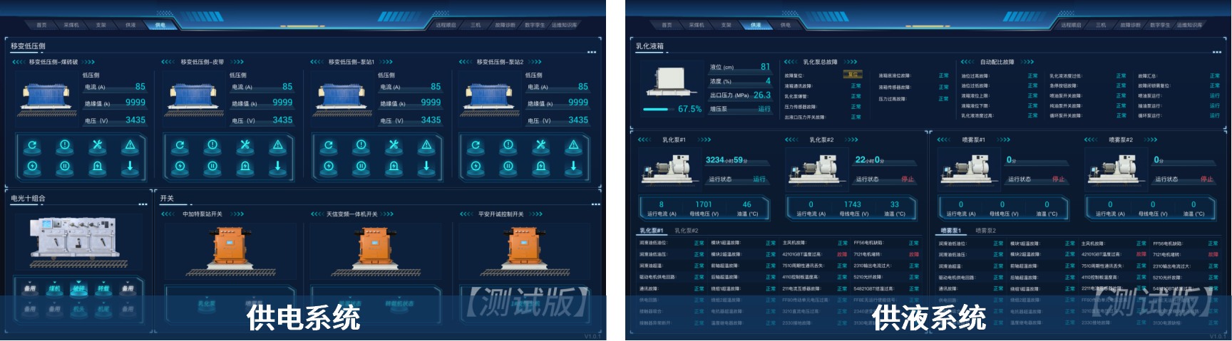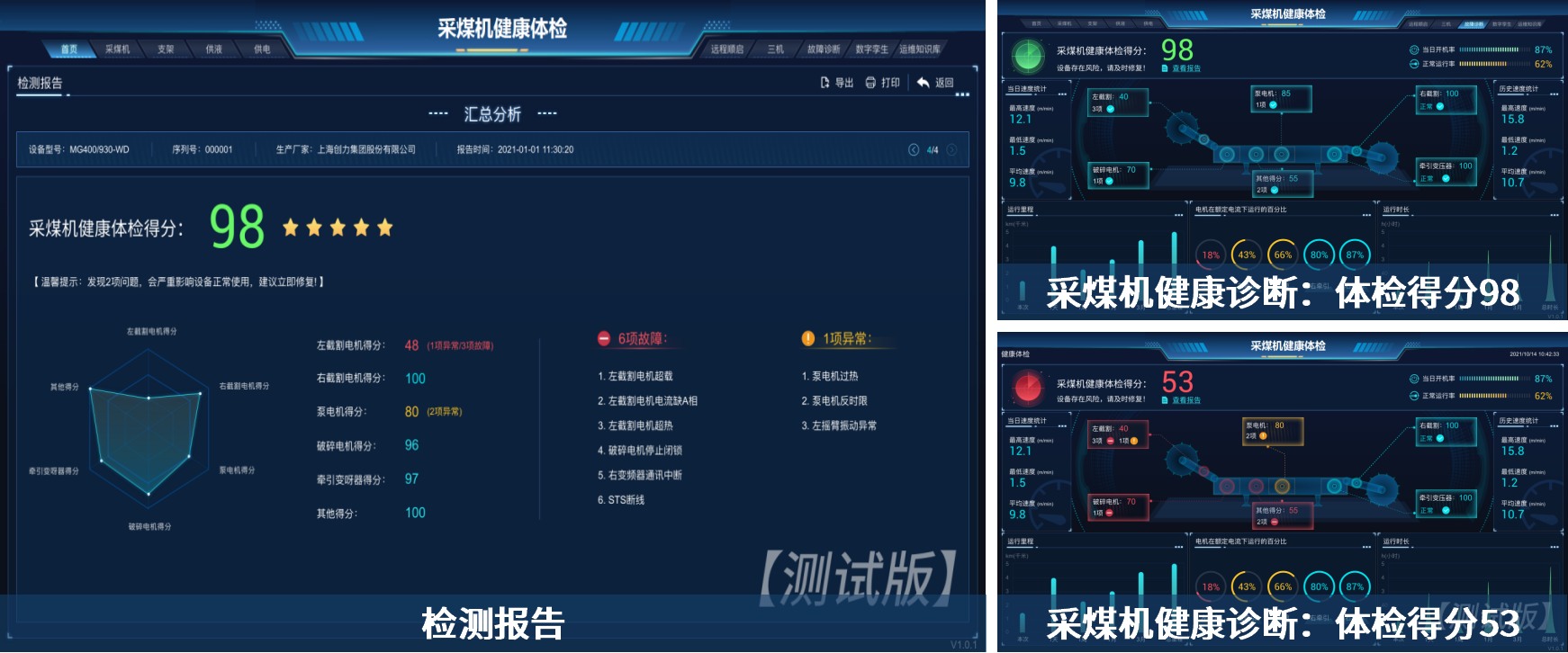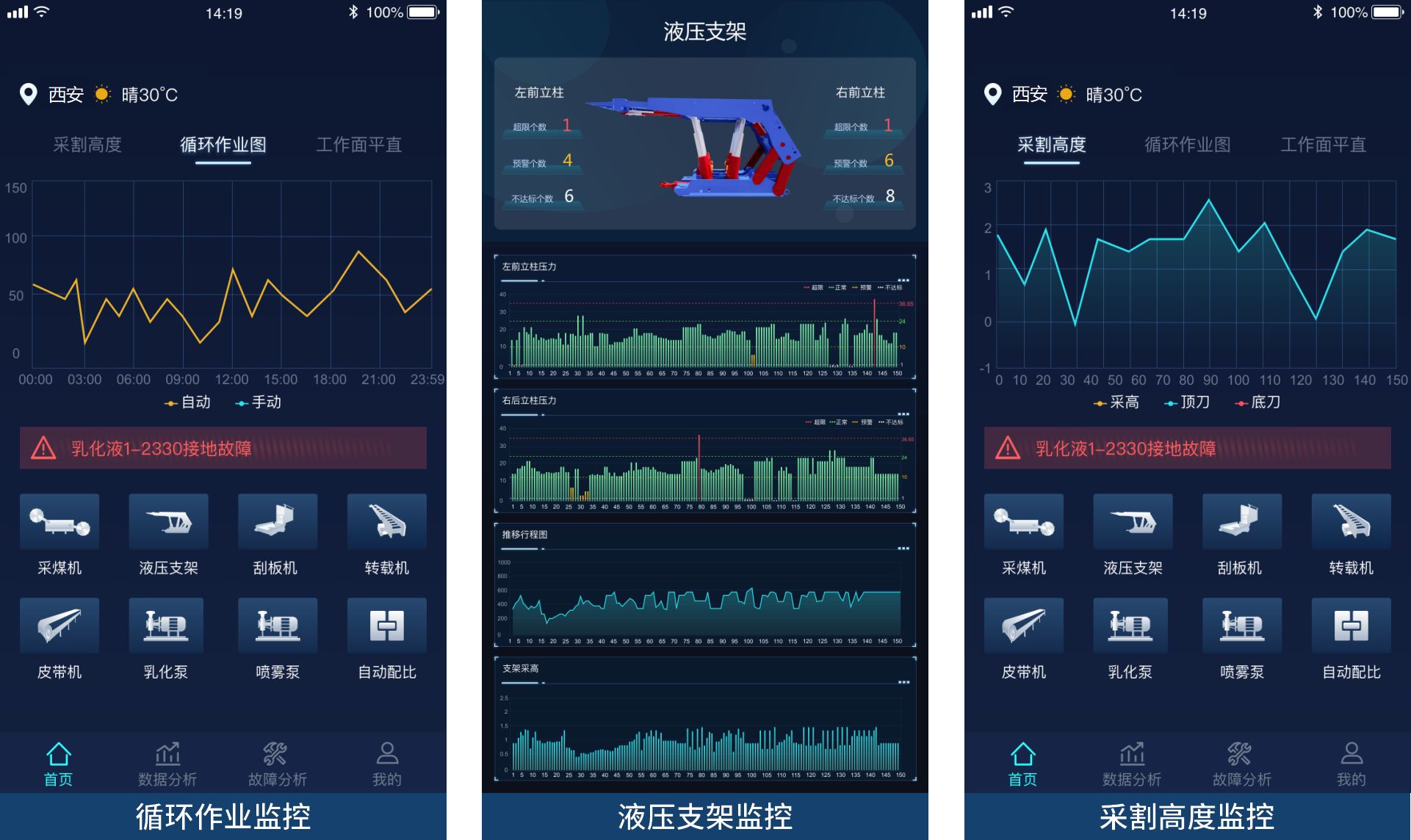 • 实时监测与故障预警:包括采煤机电截割/牵引/油泵温度、滚筒高度、俯仰角、摇摆角度、采煤机位置、行走速度等工况