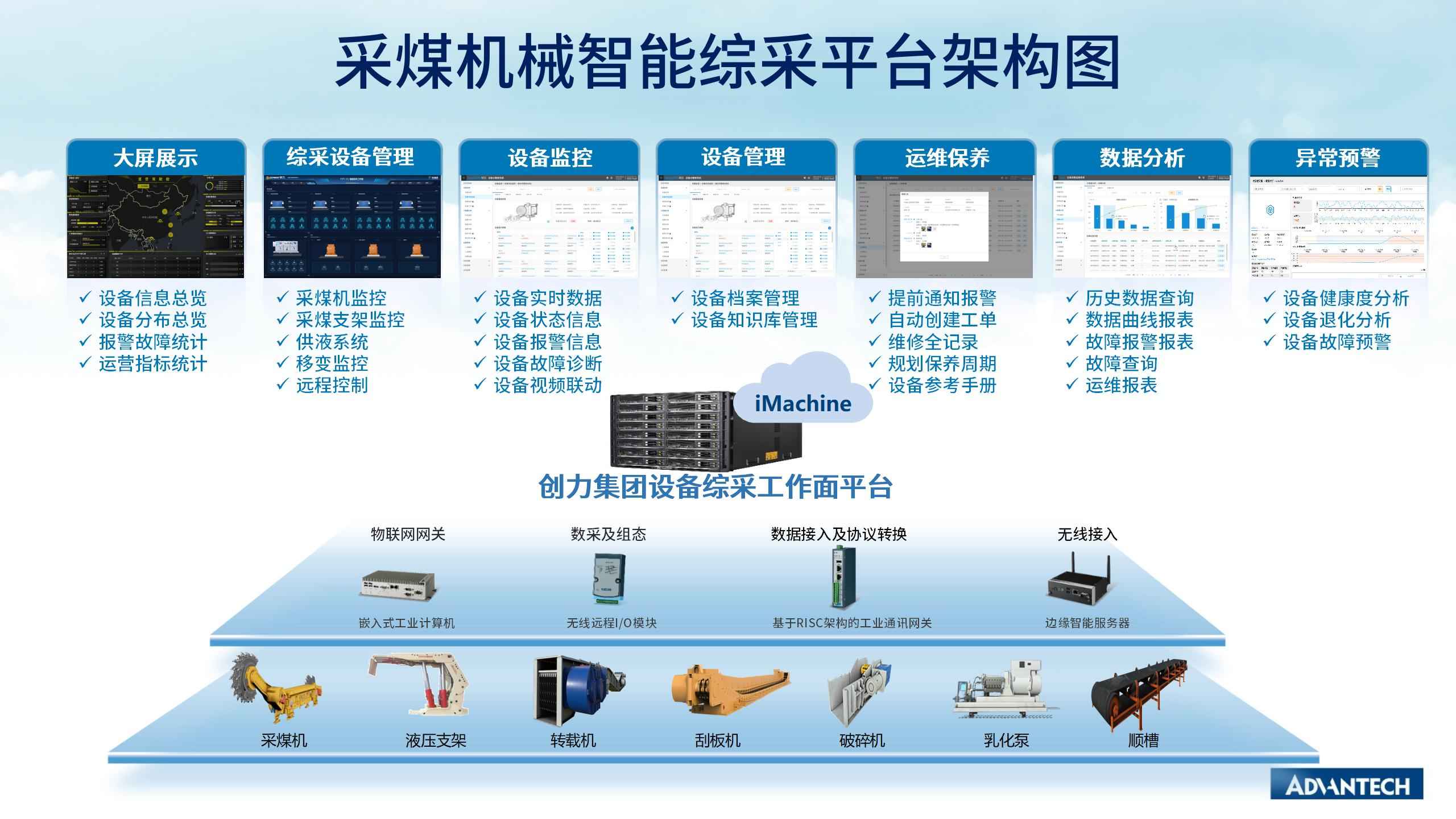 为深入实践采矿行业的两化融合,实现四岗合一、无人值守,降本增效,创力技术研究院与研华合作,依托研华iMachine设备云智联系统共创了采煤机械智能综采平台,该平台的成果已广泛应用于多个煤矿及煤机设备的远程运维领域。