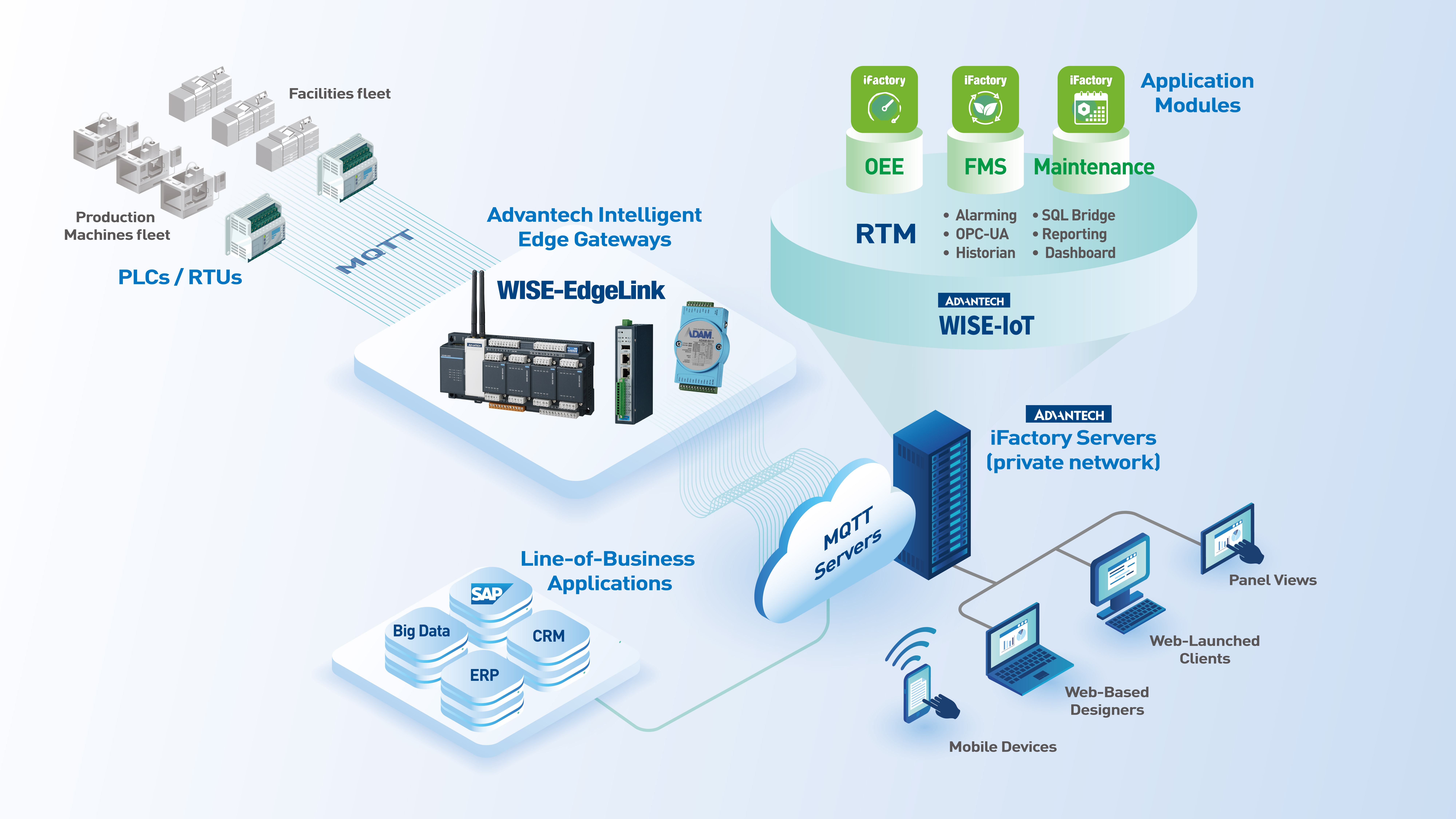 iFactory 解決方案專為製造車間的插件可視化和數據分析而設計。 它可以幫助製造商快速了解物聯網實施的價值,並透過模組化輕鬆實現從機台到機台、從站點到站點的擴展。