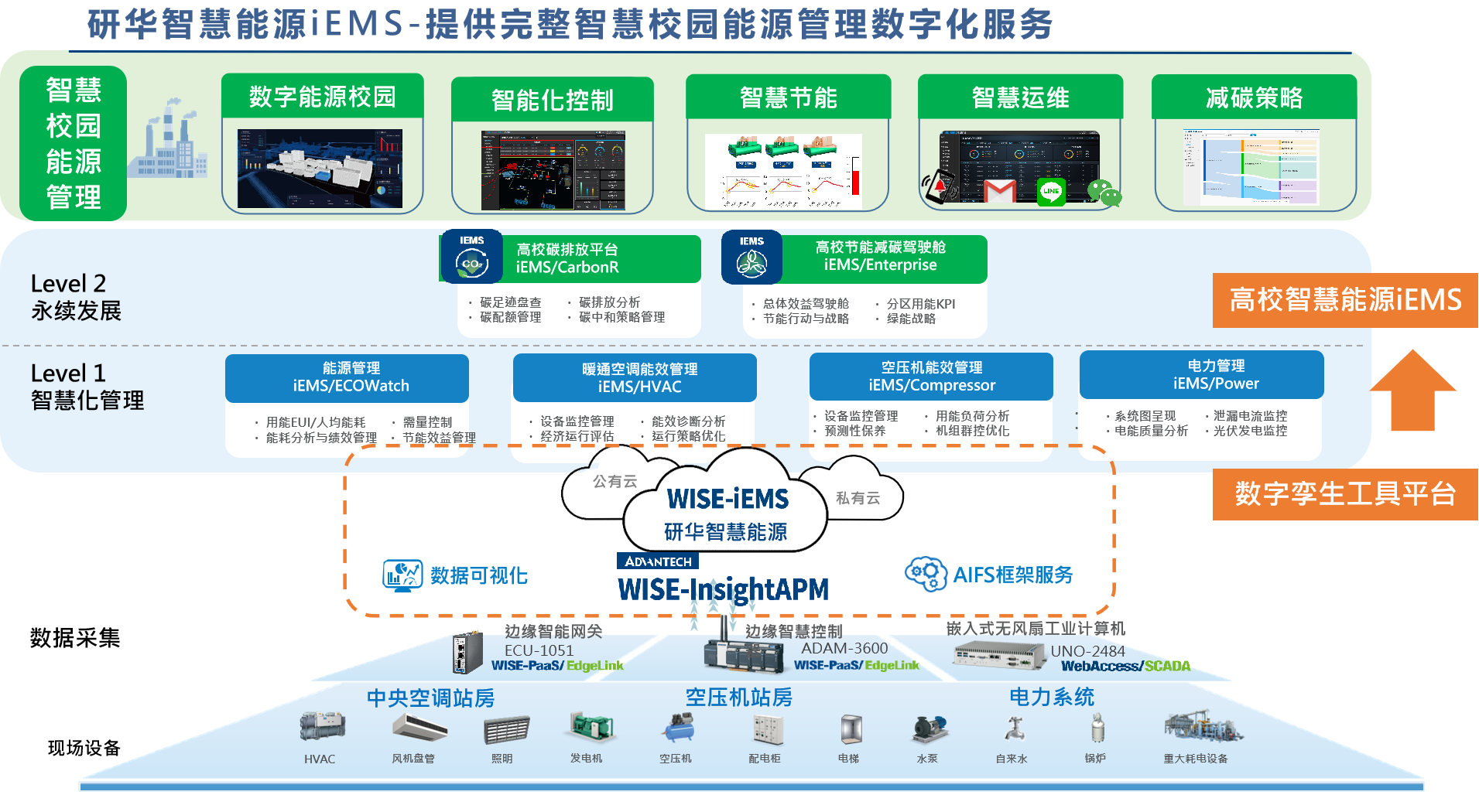 WISE-InisghtAPM具有高性能微服务框架、零代码组态设计、数字模型管理、安全体系、灵活部署和开放架构六大核心能力。自上线以来,已成功帮助100+海内外企业构建包括智慧能源、智慧建筑、设备智联、智慧城市在内等多个行业解决方案。iEMS是能源可视化的系统、是数字化系统,研华希望通过对碳排放的量化分析,提供节能减排方案,助力校园实现碳中和。