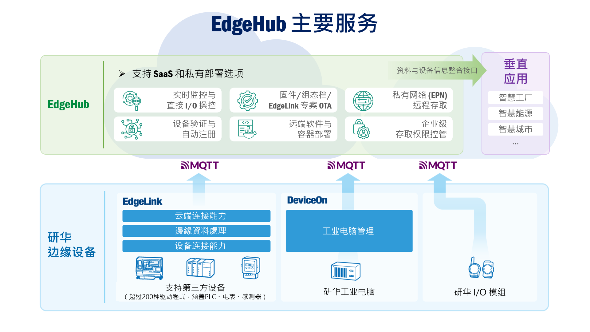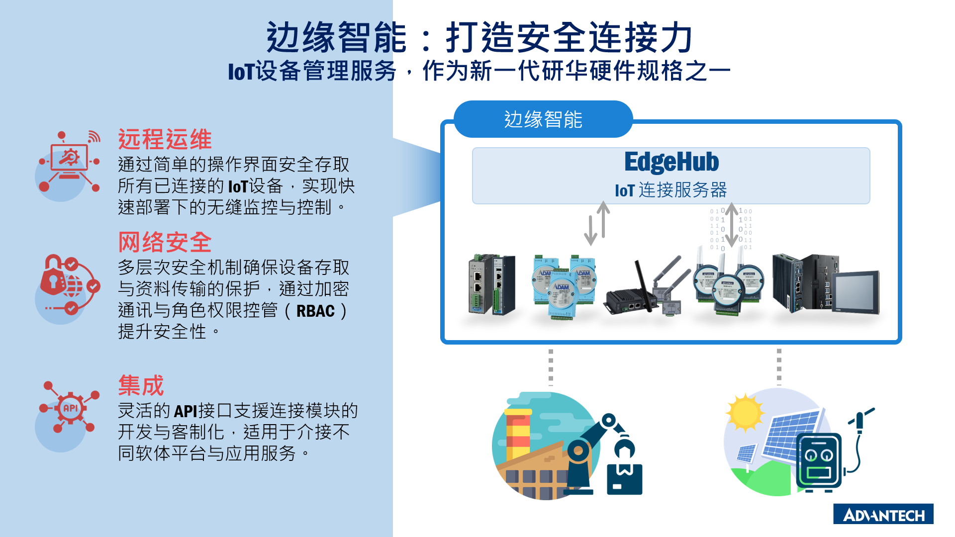 这不仅是一个独立的软件套件,更是研华硬件的一部分。EdgeHub 作为内建的管理功能,提供一套完整、具备未来扩展性的解决方案,长期以来深受客户信赖。